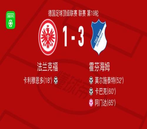 北京时间1月24日,德国足球顶级联赛第19轮,法兰克福主场对阵霍芬海姆。卡利穆恩多率先破门,为法兰克福取得领先;随后莫尔施泰特破门,卡巴克再入一球,霍芬海姆连扳两球反超;阿门达不慎自摆乌龙,令霍芬海姆扩大优势。最终,法兰克福1比3不敌霍芬海姆。